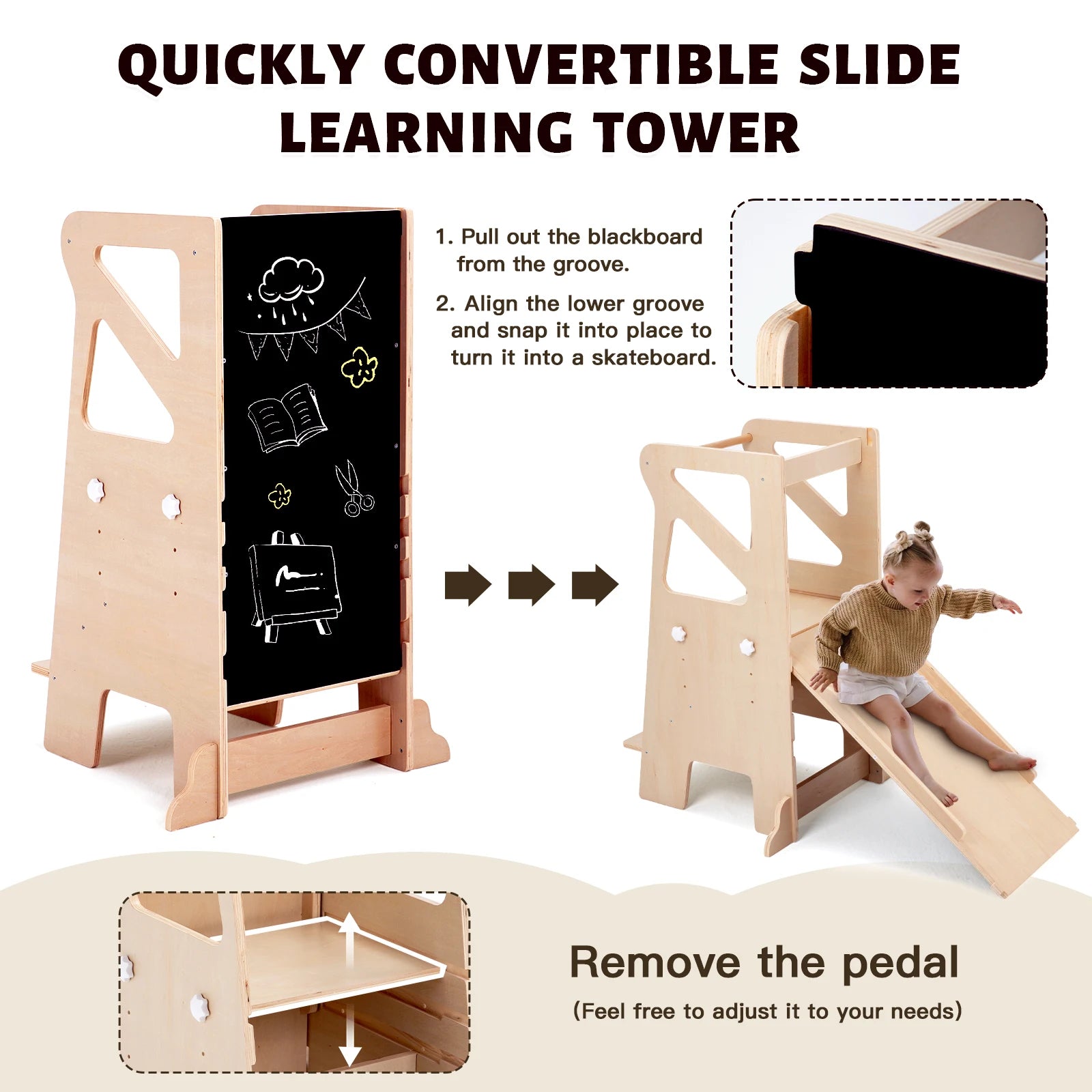 Encourage independence and creativity with this Montessori Wooden Learning Tower. Designed as a 4-in-1 multifunctional kitchen helper, it allows toddlers to safely reach counters, sinks, or tables while also featuring an adjustable chalkboard for drawing and learning.